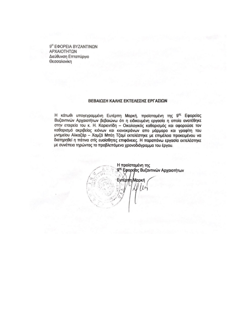 Bεβαίωση Καλής Εκτέλεσης Εργασιών Χαμζά Μπέη